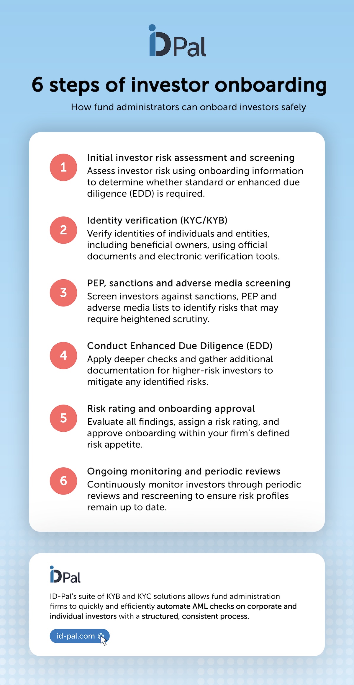 Ongoing monitoring involves periodic reviews, re-screening against sanctions and PEP lists, and reviewing activity during key events such as redemptions, changes in control or additional subscriptions. Using specialised software such as ID-Pal’s suite of KYB and KYC tools allows fund admins to quickly and automate these checks on corporate and individual investors with a structured, consistent process.